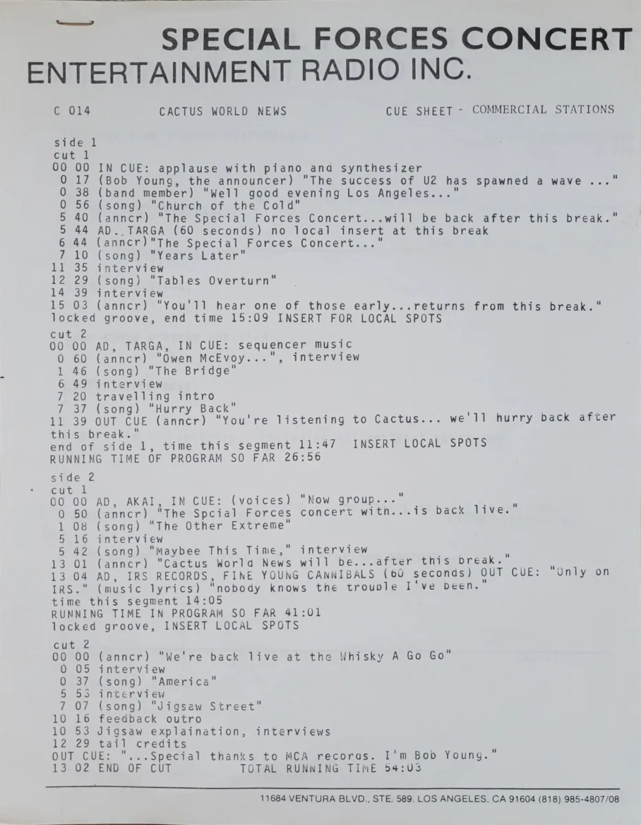 Includes the cue sheet for radio programming and the original advertisements. This show was recorded at the Whiskey A Go-Go in Los Angeles.