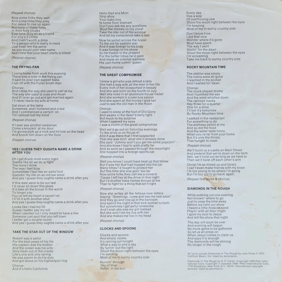 I just love Prine’s songwriting: “Souvenirs,” “Yes I Guess They Oughta Name A Drink After You” and “Late John Garfield Blues” on this LP. He also does “Diamonds in the Rough” by AP Carter. Naming the LP after the one cover as a singer-songwriter is a bold move.