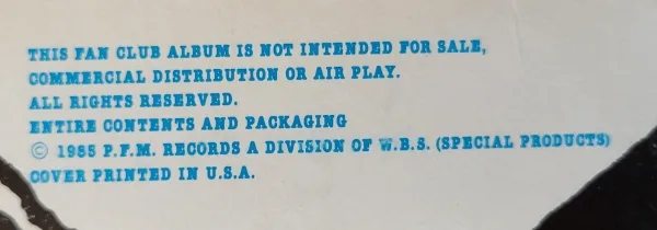 It was recorded by the mobile unit of Reflection Sound Studios and then bootlegged, with this notation on the rear cover: “This Fan Club album is not intended for sale, commercial distribution or air play. All rights reserved. Entire packaging and contents copyright 1985 P.F.M. Records a Division of S.B.W. (Special Products). Cover printed in the U.S.A.”