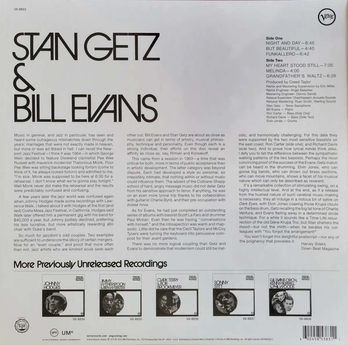 Sometimes just referred to as Stan Getz & Bill Evans, this was recorded in 1964 but not released until 1974. Ron Carter (A side) and Richard Davis (B side) on bass, with Elvin Jones on drums. Recorded at Rudy Van Gelder’s studio in Englewood Cliffs NJ and produced by Creed Taylor.