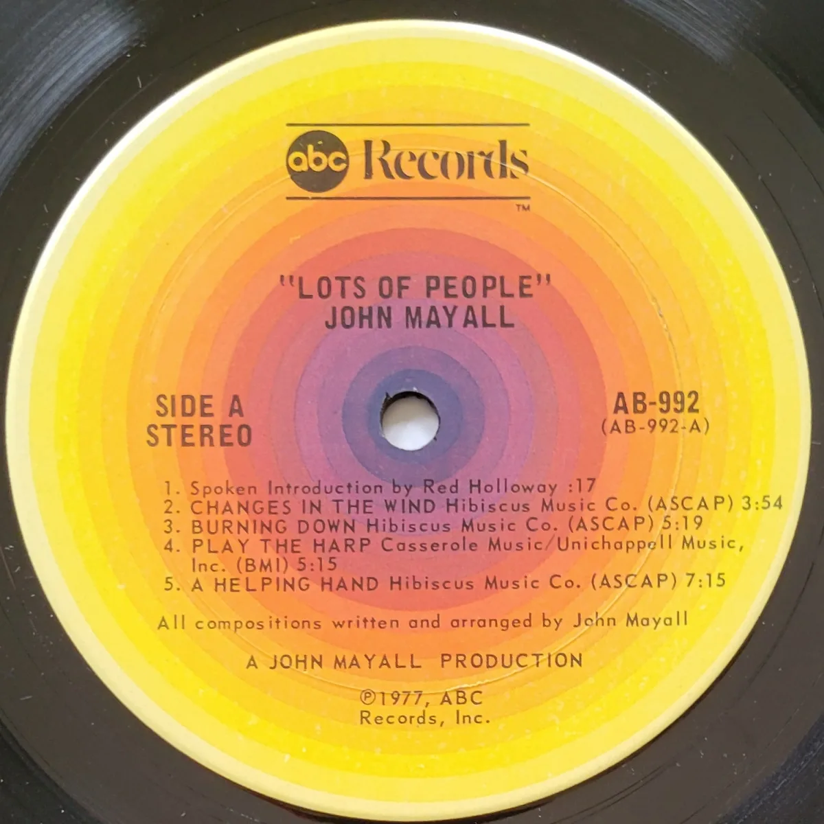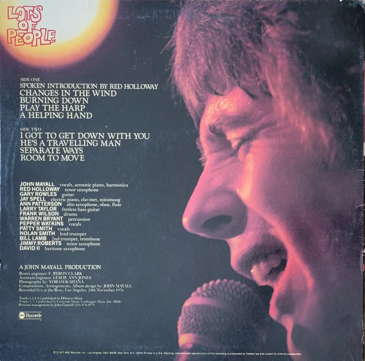 Mayall live from The Roxy in LA, recorded November 24th, 1976. This was Mayall’s eighth live album, with supporting band including a horn section with Red Holloway, Ann Patterson, David Li, Jimmy Roberts, Bill Lamb, and Nolan Smith. That’s lots of people on stage.