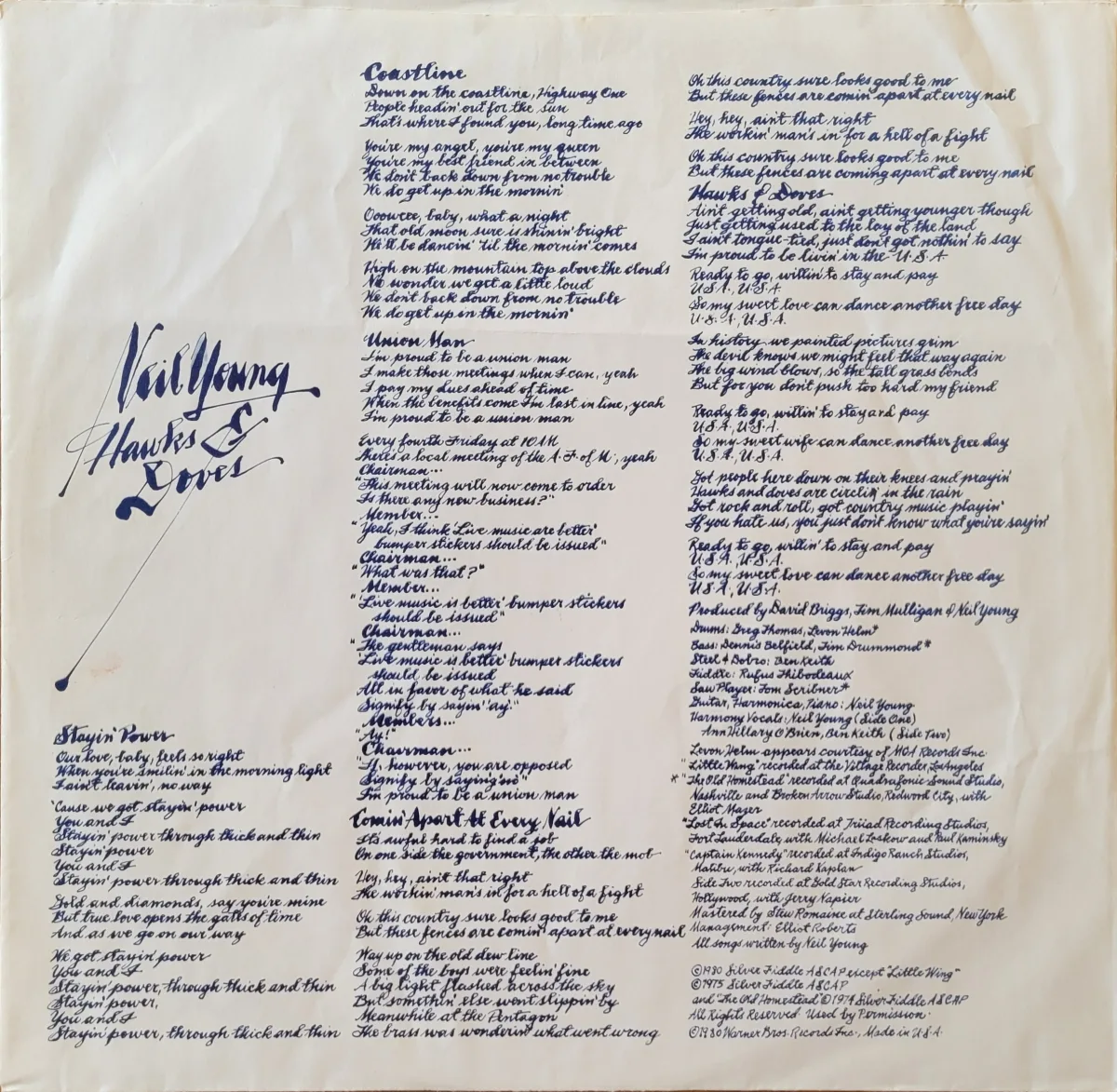 Young is joined by Levon Helm, Tim Drummond, and Tom Scribner on Side 1, and by Greg Thomas, Dennis Belfield, Ben Keith, and Rufus Thibodeux on Side 2, which was recorded at Gold Star in Hollywood.