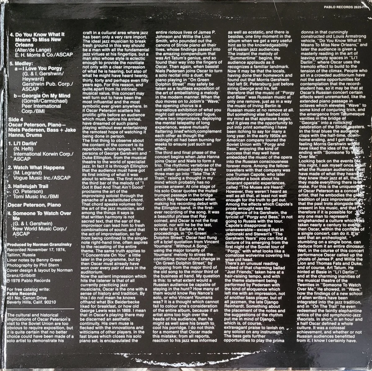 Peterson recorded November 17, 1974 in Tallinn, Estonia (listed as Tallinn Russia) with Niels Pederson and Jake Hanna.