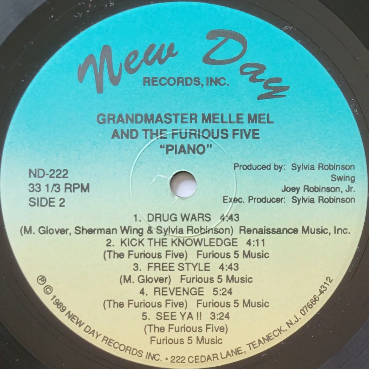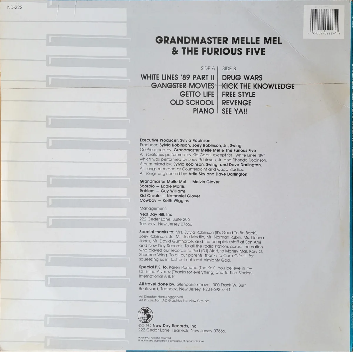 After the split between Grandmaster Flash and Melle Mel, Mel took the “Grandmaster” role and continued with the Furious Five splitting. On this record the Furious Five include Cowboy, Scorpio, Rahiem, and Kidd Creole (credited as Kid Creole), but no Flash.