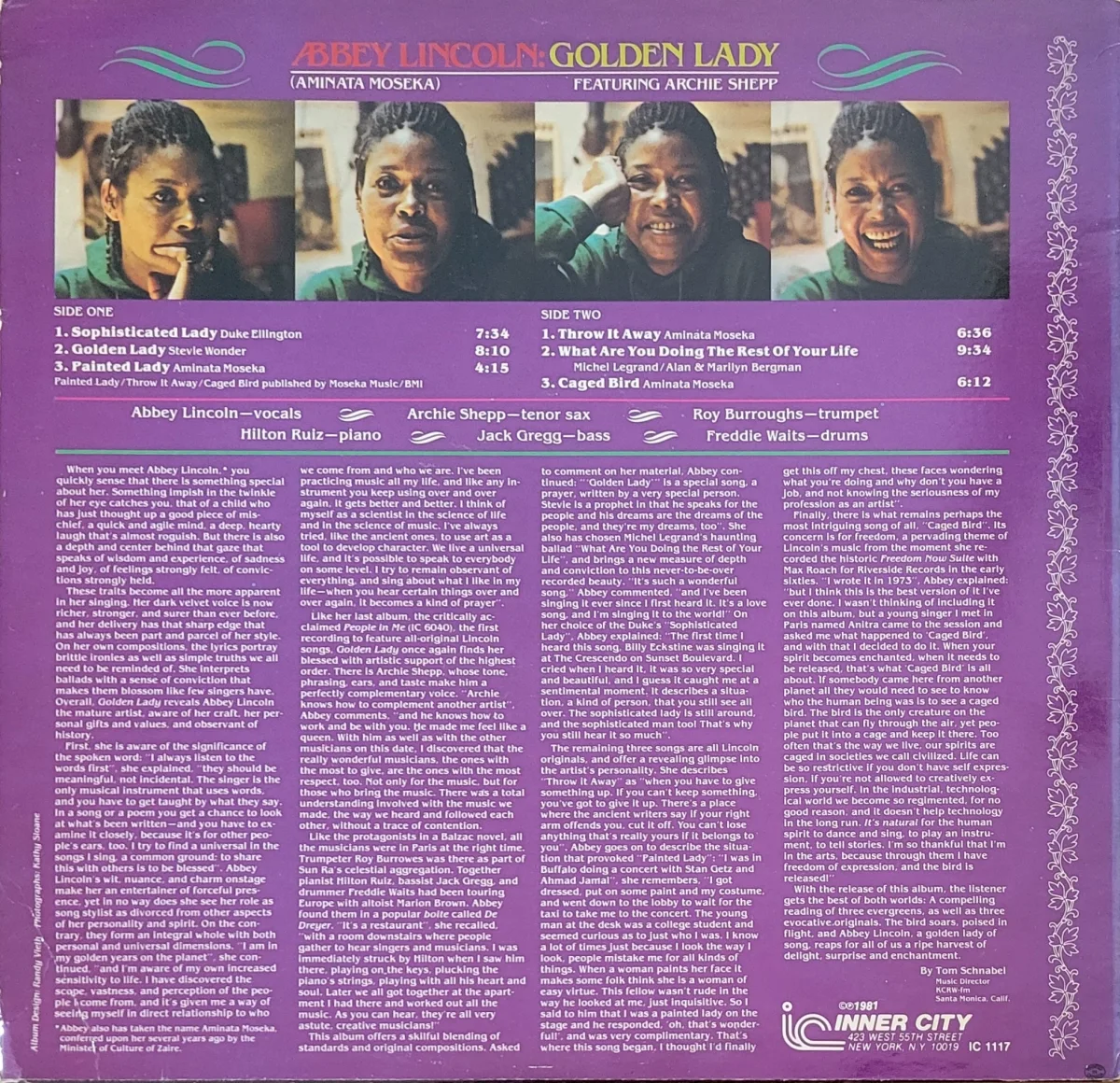 Originally issued by Blue Marge in France under the name Painted Lady (Abbey Lincoln in Paris), the first US issue was on Inner City Records under the name Golden Lady. Aminata Moseka, the name she adopted in the mid seventies, also appears in a parenthetical on the cover, along with Archie Shepp who accompanies her.