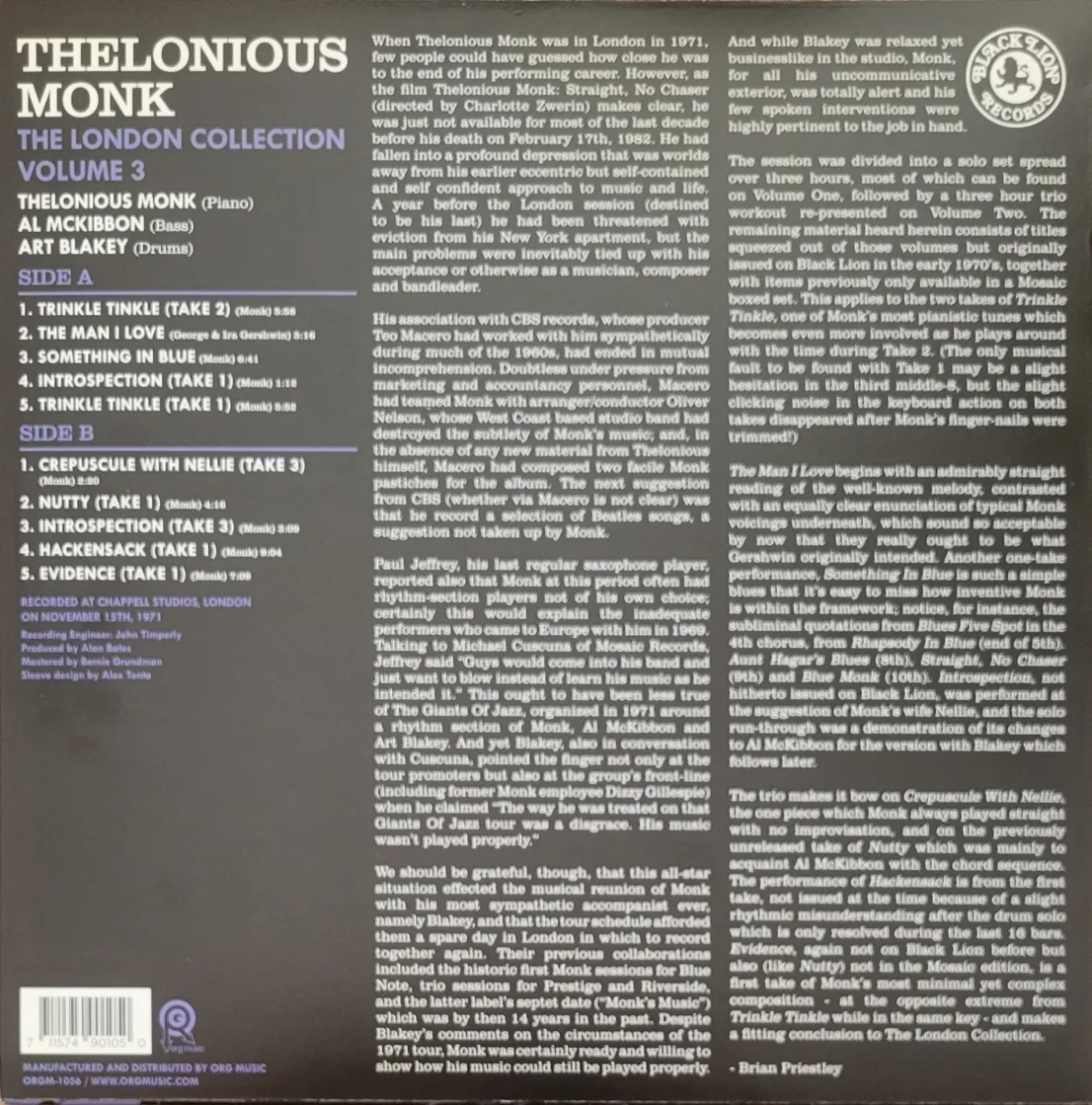 Recorded at Chappell Studios in London Nov 15th, 1971 but not released until the late 80s on Black Lion, these recordings are from near the end of his recording and performing career. Monk’s joined by Al McKibbon on bass and Art Blakey on drums.
