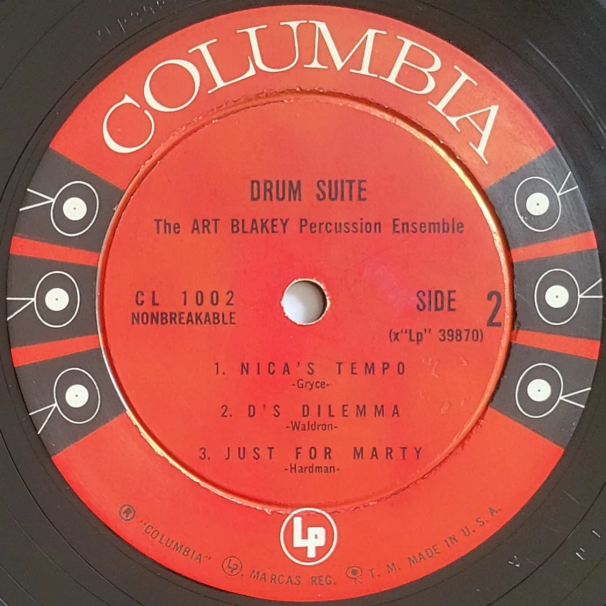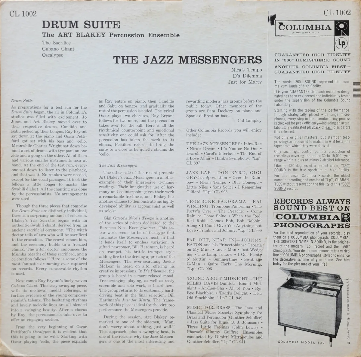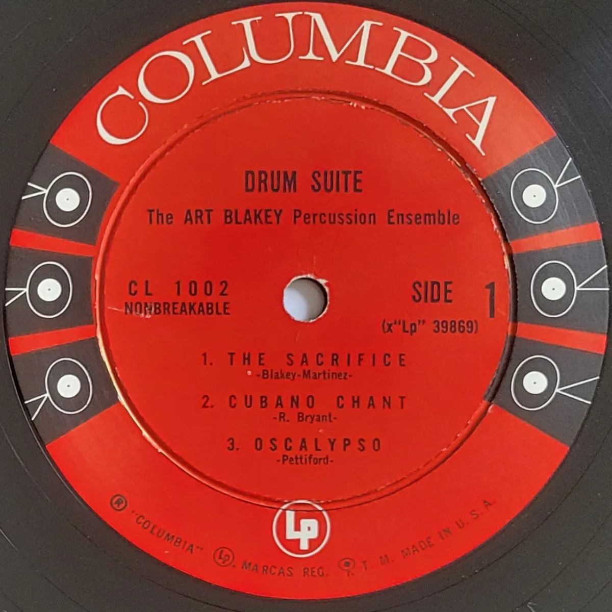 My copy—via private sale—is a 1950s Columbia Hollywood plant pressing with the 6-eye label. The artist is credited as “The Art Blakey Percussion Ensemble” on both labels but the cover credits the B side to the Jazz Messengers.